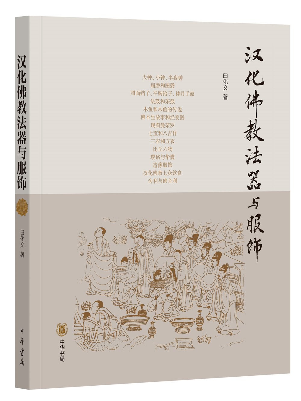 《汉化佛教法器与服饰》详细地介绍了佛教的各种法器与服饰,具体包括呗器(如钟、鼓、木鱼等)、庄严具、曼荼罗、供具与供物(如七宝与八吉祥等)、僧人的法服与常服、随身具(如比丘六物、齿木、净瓶、戒刀、拂尘、锡杖等)以及璎珞、花鬘、数珠等。是一本关于佛教器物和服饰的普及性读物。