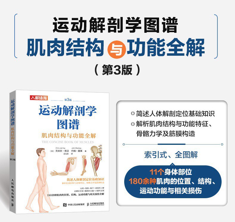 运动解剖学是运动相关学科的基础和必须学习的内容。《运动解剖学图谱:肌肉结构与功能全解(第3版)》介绍了解剖学基础知识,重点对头部、颈部、躯干、肩部、手臂、髋部和腿部等身体部位的180余种主要肌肉的起点、止点、作用、神经支配和基本功能动作进行了讲解,并对部分肌肉长期紧张或缩短时容易产生的疼痛和损伤进行了介绍。不论是体育院校相关专业的老师和学生,还是健身及运动爱好者,都可以通过《运动解剖学图谱:肌肉结构与功能全解(第3版)》更全面地了解肌肉的结构与功能。