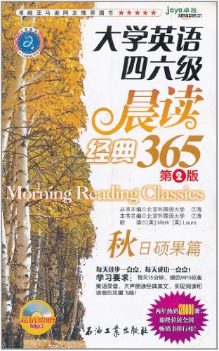 《大学英语四六级晨读经典365(第2版)·秋日硕果篇(附MP31张)》是由石油工业出版社出版的。现在,你手上拿到的就是大学英语四六级晨读经典365(第2版)系列丛书-秋日硕果篇,用名人的光辉照亮你前行道路。学习要求:每天15分钟,模仿MP3标准美语录音,大声朗读经典美文,实现阅读和语音的双重飞越!