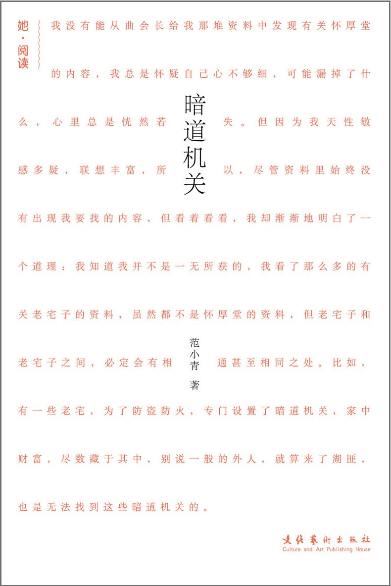 《暗道机关》内容简介:汇集了范小青近两年创作的中、短篇小说。这些小说贴近生活,涉及“官场”等多维话题,专注于小人物的命运,将社会的变革融入岁月的沧桑。用一枝笔将江南小城、吴越乡村,连同那些街巷阡陌中的寻常人物描绘得栩栩如生。她的作品看似闲话家常,但无不浸润着姑苏风物的素淡细致,文字间像是氤氲着淡淡水汽,将江南的古老、精致、典雅透过笔墨呈现在读者面前。