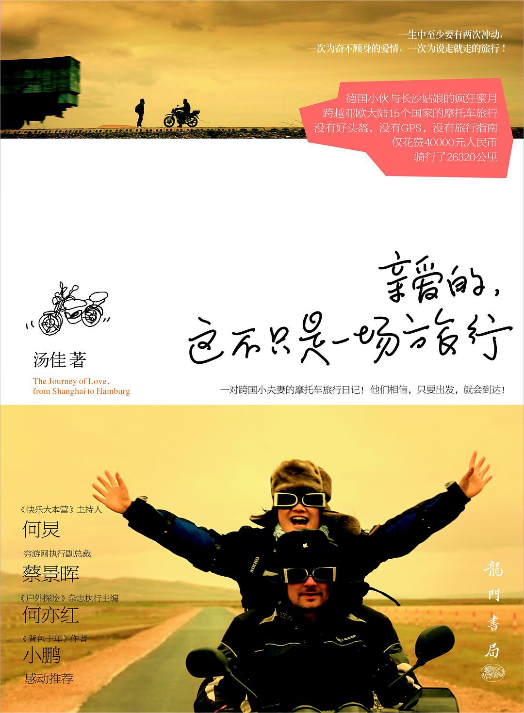 81年德国汉堡小伙和84年湖南长沙妹子,仅凭着一股对梦想的坚持和追寻,骑一辆雅马哈YBR125摩托车展开他们为期4个半月的蜜月旅行。一路上,汤佳和托马斯经历了惊心动魄的冒险,遇到过美丽的人,听到过动人的故事……仅花费4万元,跨越两大洲,游历15个国家,骑行26320公里,完成一段不一般的旅行。