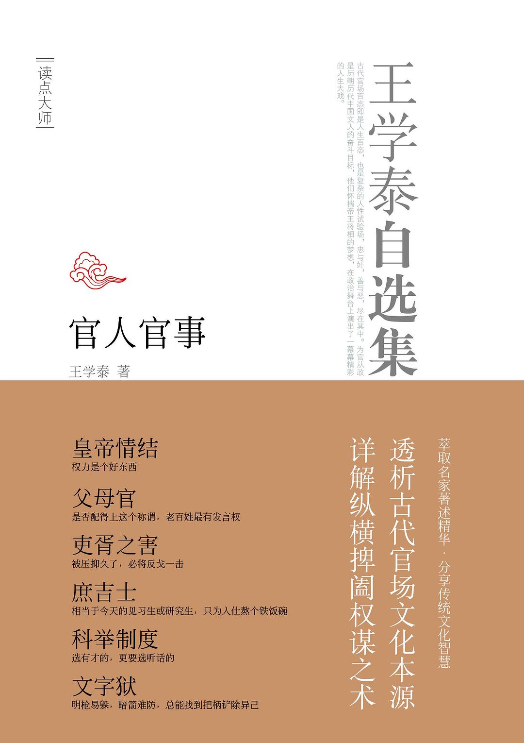 《王学泰自选集:官人官事》内容简介:官场文化精彩纷呈,各色面孔,各种言行,构成了一幕幕生动而又难以预料的剧目。与每个剧目相关的历史人物和事件,都是现代人解读中国历史文化、政治制度的一个窗口。中国古代官场文化又独具中国特色,不论太平盛世,还是战乱年代,始终充斥着多方利益的权谋争斗。只有透析和解读古代官场文化的本质特征,才能使我们了解古代官场表象下的真实。