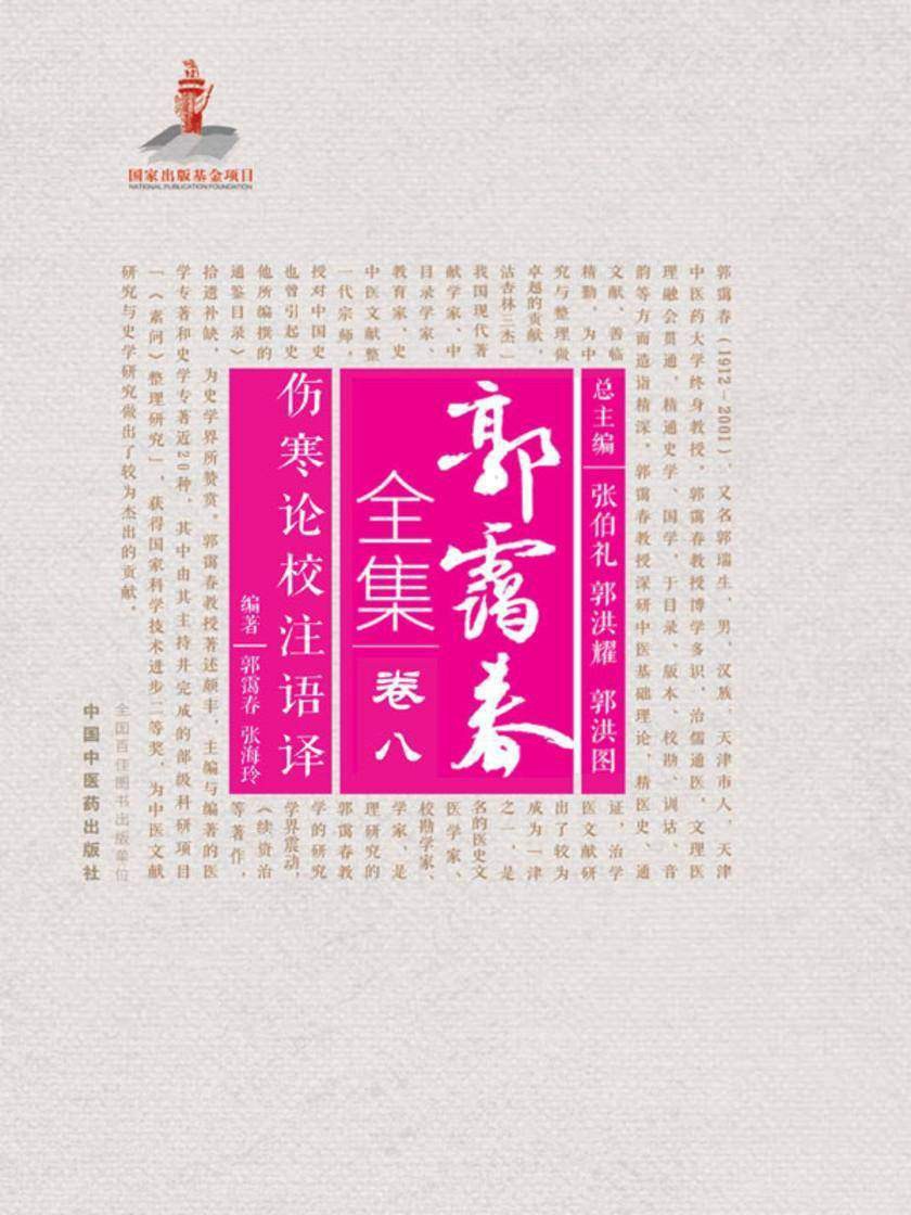 《郭霭春全集》收录郭霭春教授著作共计800万字左右。《伤寒论白话解》为《郭霭春全集》之一,主要内容是对《伤寒论》进行校勘和注释同时,予以语译,以通俗易懂的白话文形式解读。《全集》全面反映了他在中医药学领域的学术成就。郭霭春先生治儒通医,文理医理融会贯通,精通史学、国学,于目录、版本、校勘、训诂、音韵等专门之学,造诣精深,并善诗词。他深研中医基础理论,精医史、善临证,尤以文献研究和中医内科见长,有“津沽杏林三杰”之誉。治学精勤,著作颇丰,其代表作有《黄帝内经素问校注》《灵枢经校释》《黄帝内经素问校注语译》《灵枢经校注语译》《中国医史年表》《中国分省医籍考》等。
