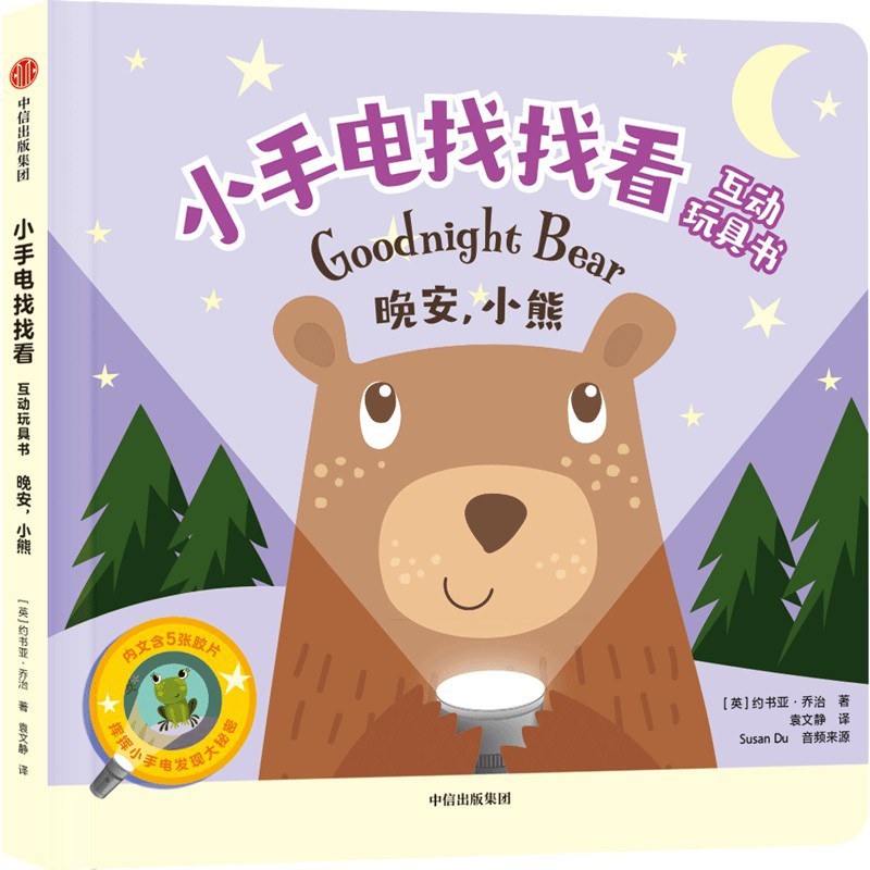 这是一本适合1.5~4岁亲子共读的低幼纸板玩具书。小熊正准备睡觉,但她首先要对所有的动物朋友说晚安。在夜晚场景中发现不同的动物,跟动物说晚安,认识不同动物的名称以及它们栖息地,轻松科普、双语启蒙。在互动形式上,利用夹层和胶片的巧妙设计,制作出神奇手电筒的效果。充分调动孩子的积极性,小手电找找看,提升宝宝观察力、专注力。中英双语,抓住宝宝语言黄金期,轻松双语启蒙。本书是《小手电找找看互动玩具书》系列中的一本,集齐4本小手电,认识更多可爱的动物朋友。