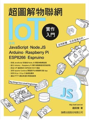 前端 JavaScript 到 后端 Node.JS 实践物联网创意 结合 Arduino 、Raspberry Pi 实作物联网感测控制节点 详述 C/P 值最高的 ESP8266 Wi-Fi 模组 活用 Apache Cordova 开发跨平台物联网行动 App 利用 D3.js / C3.js 打造咨询图表 链接 IFTT 网站串联各项云端服务