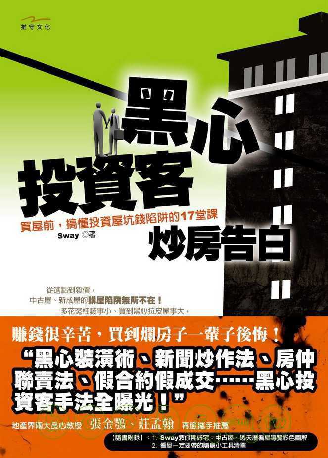 多花冤枉錢事小、買到黑心拉皮屋事大,更慘的是買到違建或兇宅還不自知!《黑心投資客炒房告白》公開投資客黑心技倆的17堂課,教你要如何降低風險、掌握議價空間。